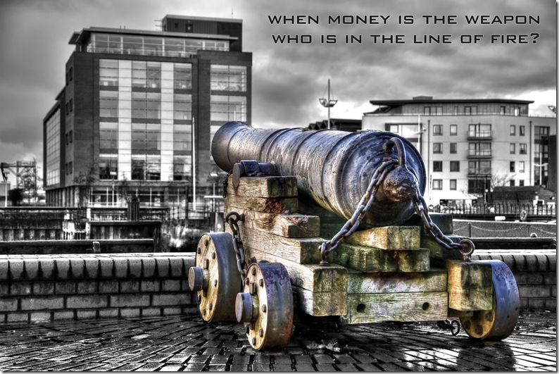 Of course nowadays more damage is done by those who wield the weapons of finance in order to achieve their aims. Huge global corporations, bankers, media moguls and billionaires exert the sort of heft that politicians dream of but struggle to achieve. It would seem that many of them are simply seduced by it. Are there any limits to what money can buy these days? With depressing regularity massive corporate takeovers, restructuring and outsourcing to cheaper labour markets lays waste to thousands of lives. The global financial crisis has caused and will continue to inflict collateral damage of epic proportions way beyond the banking sector. The greed-based culture of a few bankers has wrought carnage across the globe. Cuts in public services are likely to be savage and enduring. We are all in the line of fire.